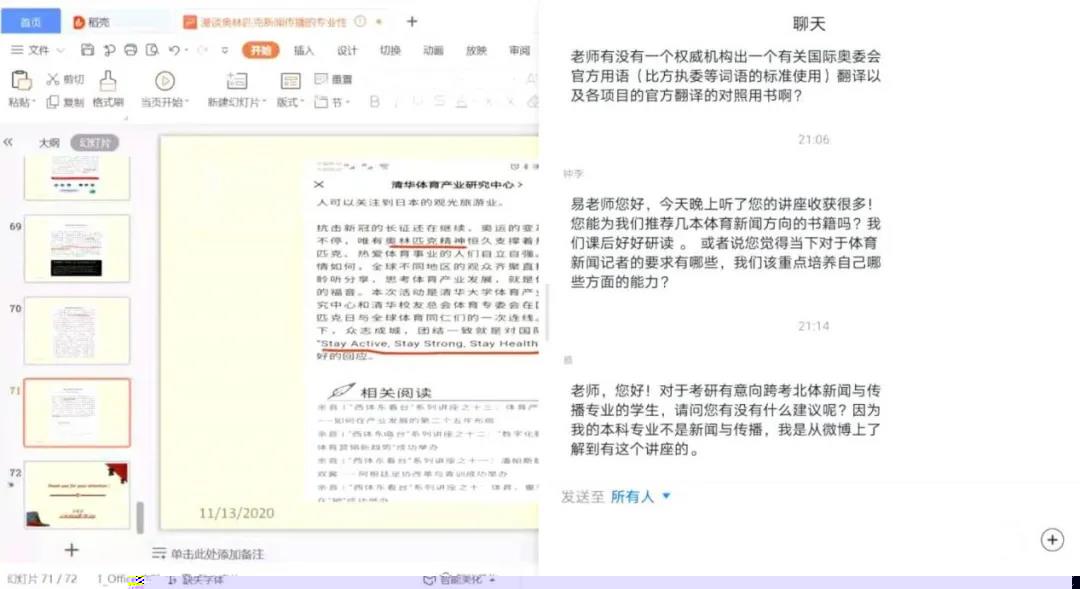 11月13日晚19點30分,關于“奧林匹克新聞傳播的專業性”的新傳講堂在騰訊會議上直播進行,近160位同學參與了線上會議。主講人易劍東老師在近兩個小時的講座中,講述了冬奧規則章程及奧委會相關知識,分享了自己參與申奧過程中的小故事,并為積極提問的同學們答疑解惑。
