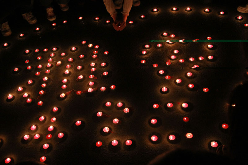 4月22日晚,2011級兩位四川籍同學何宇、王燕舞共同發起了祈福雅安的活動,通過将蠟燭擺成一顆愛心框住“雅安 4.20”,點亮希望之光,映照星空, 很多2011級、2012級的同學主動加入到他們的活動中,同學們圍繞着蠟燭進行祈禱,祈禱災區救援工作順利進行,人人安全,保佑災區的人們不再受難,早日重建家園,祝福災區人民的明天更加美好。大家用真誠心意,祝福雅安,幫雅安加油。一個個蠟燭點亮,點亮的是同學們的希望與祝福。