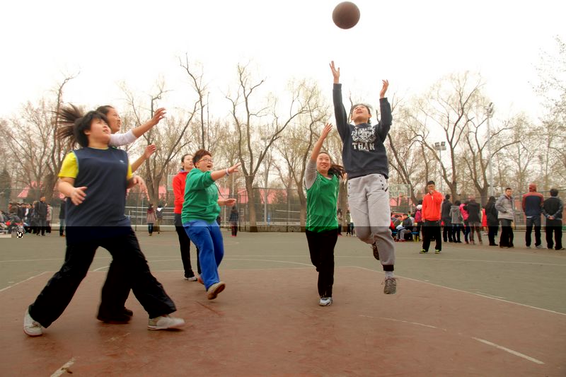 12點30分,比賽開始,研究生院與10新聞在籃球場呈現精彩男籃球賽,與此同時,09新聞與11新聞的女籃比賽在隔壁場地進行,11級輔導員盧雪老師到場加油助威。